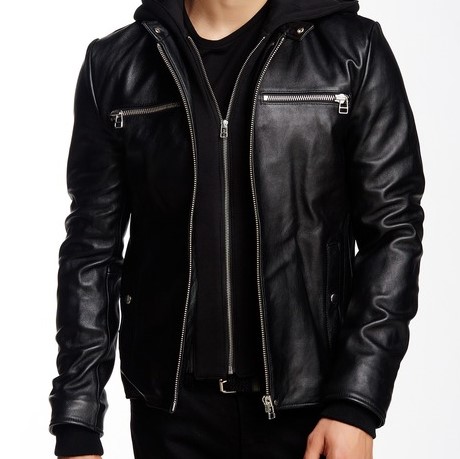 Men Black Detachable Fabric Hooded Leather Jacket, Biker Leather Jacket