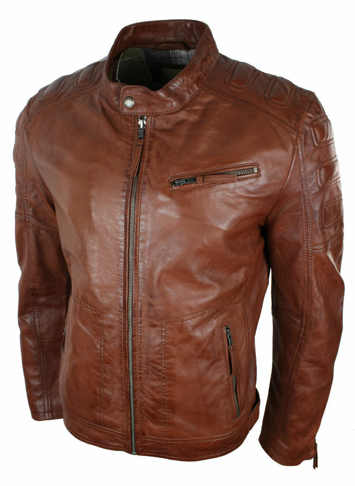Mens Retro Style Zipped Biker Brown Real Leather Jacket