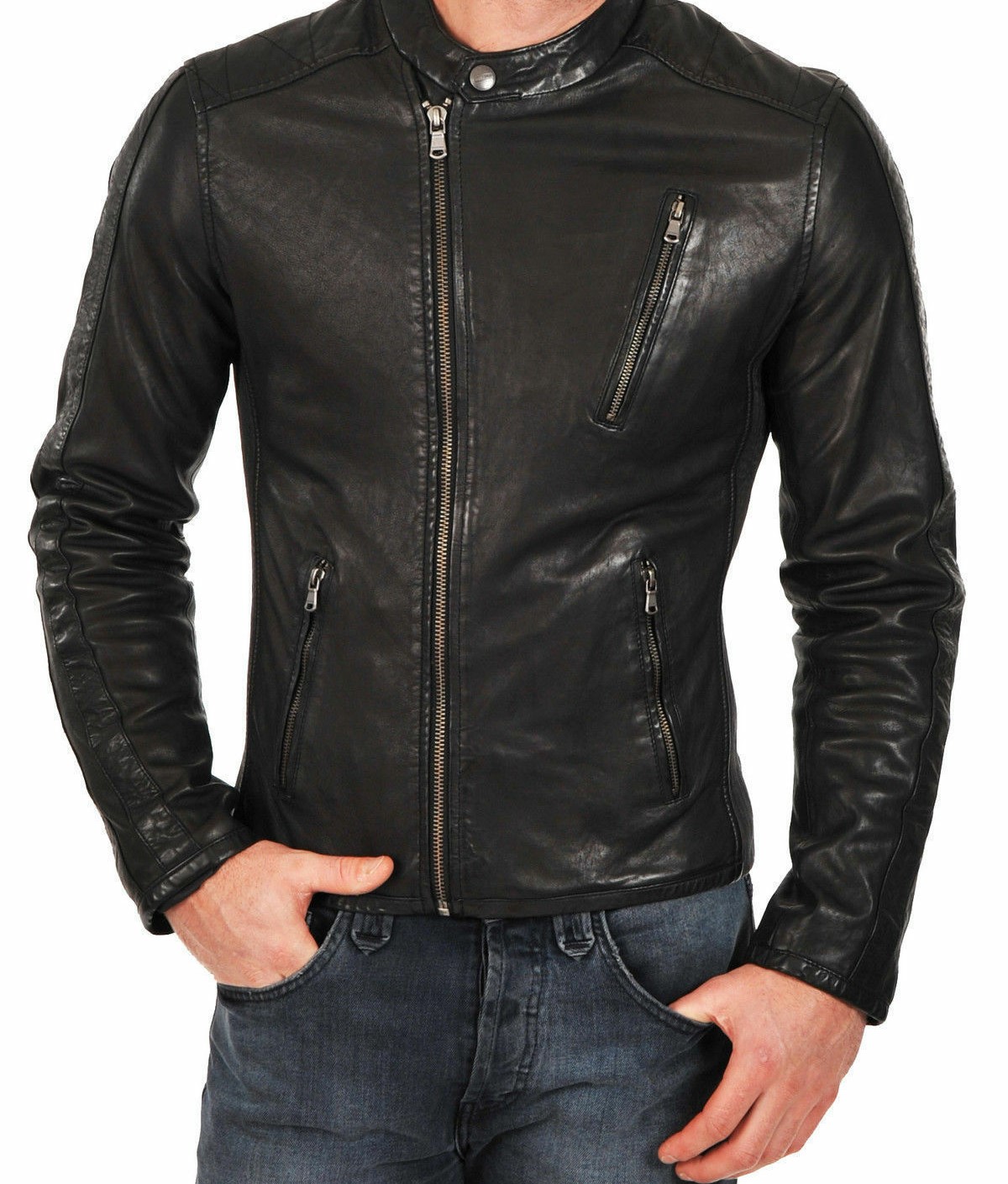 MENS CLUB BLACK REAL LEATHER JACKET VINTAGE SLIM FIT JACKET