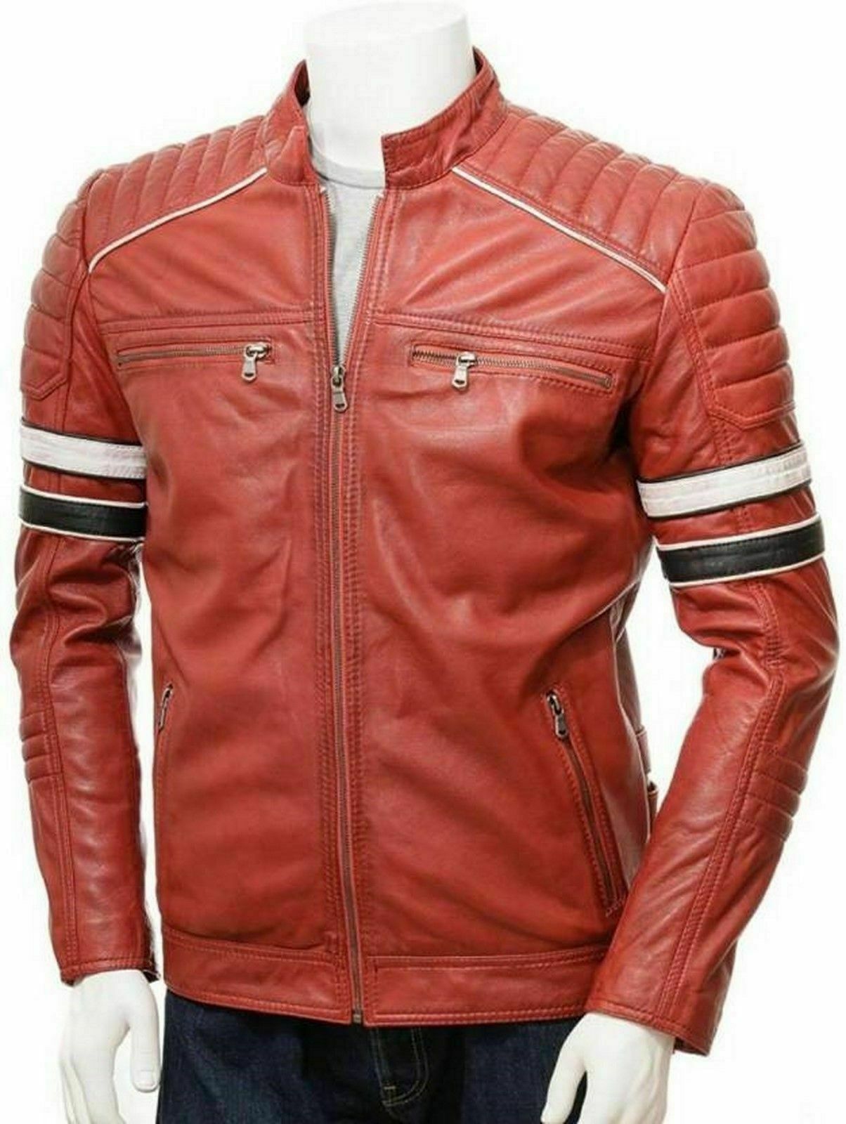 Leather Jacket Men's Genuine Lambskin Red Jacket Black & White Stripes Biker