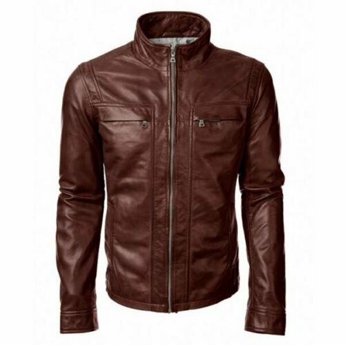 Men's Leather Jacket Genuine Lambskin Round Neck Brown Leather Biker Jacket
