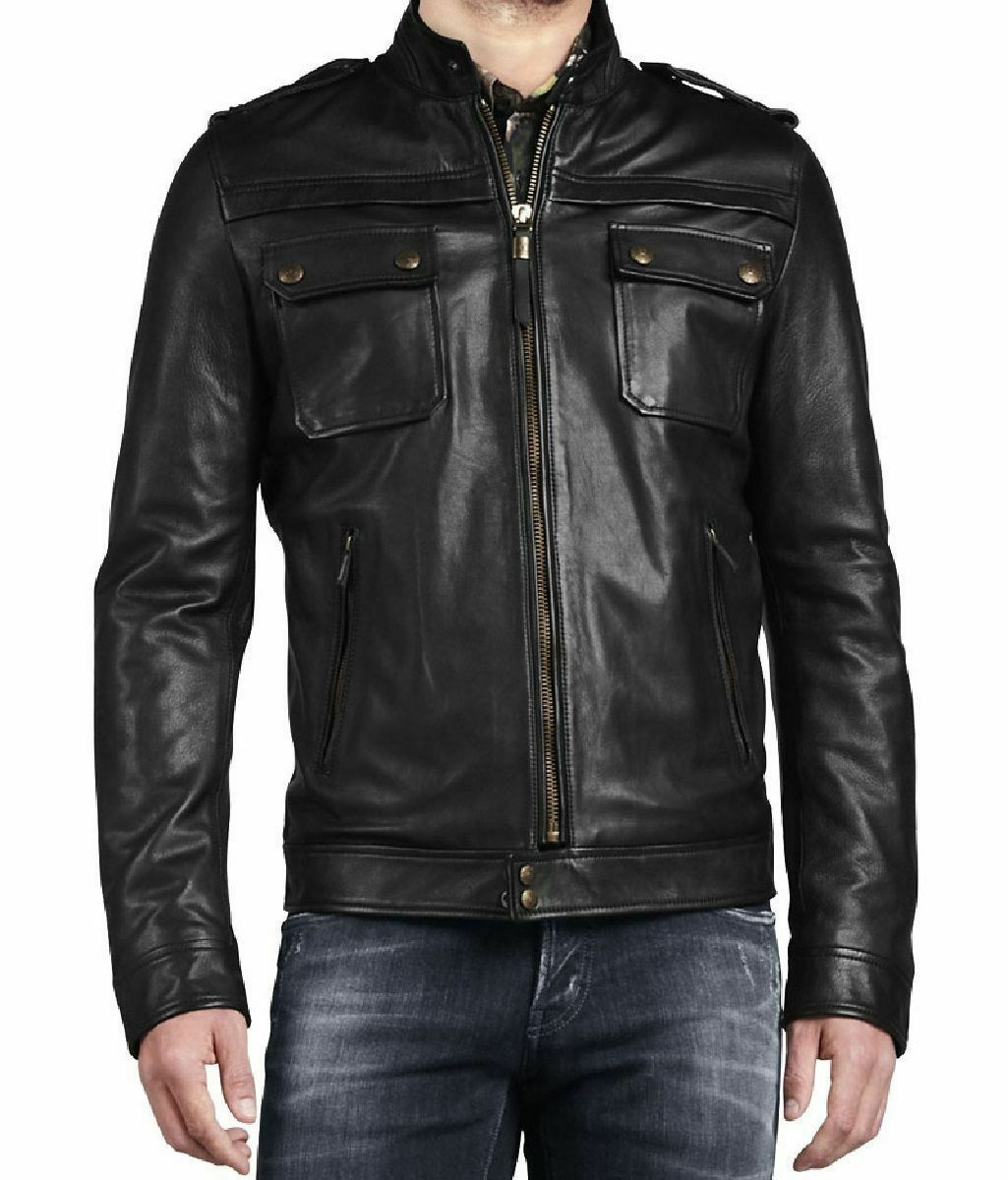 Men's New Stylish Biker Motorcycle Black Genuine Lambskin Leather