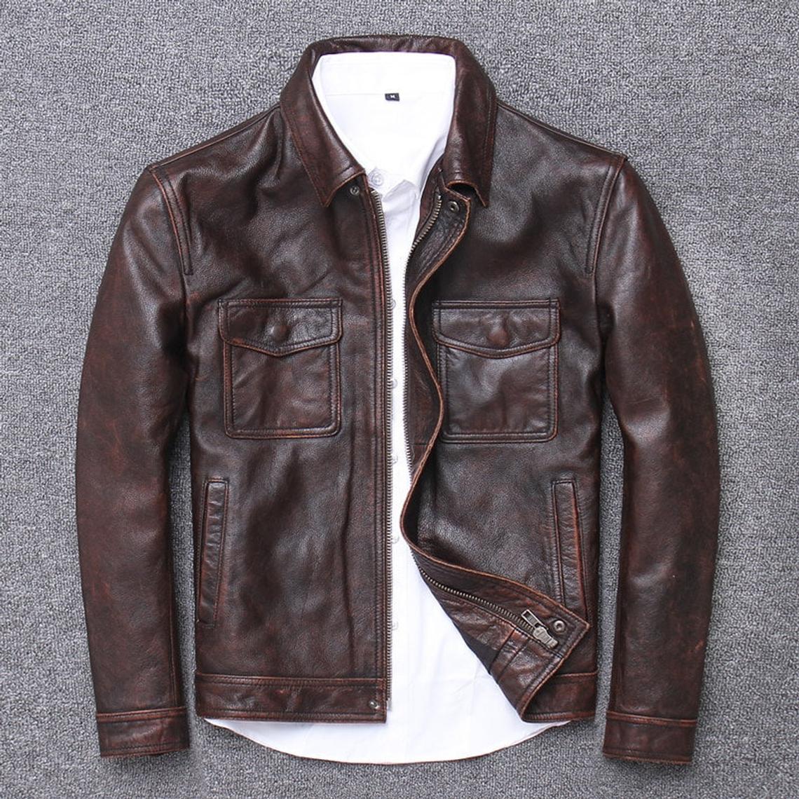 Mens Genuine Leather Jacket Biker Motorcycle Retro Classic Cafe Racer Vintage Leather Brown
