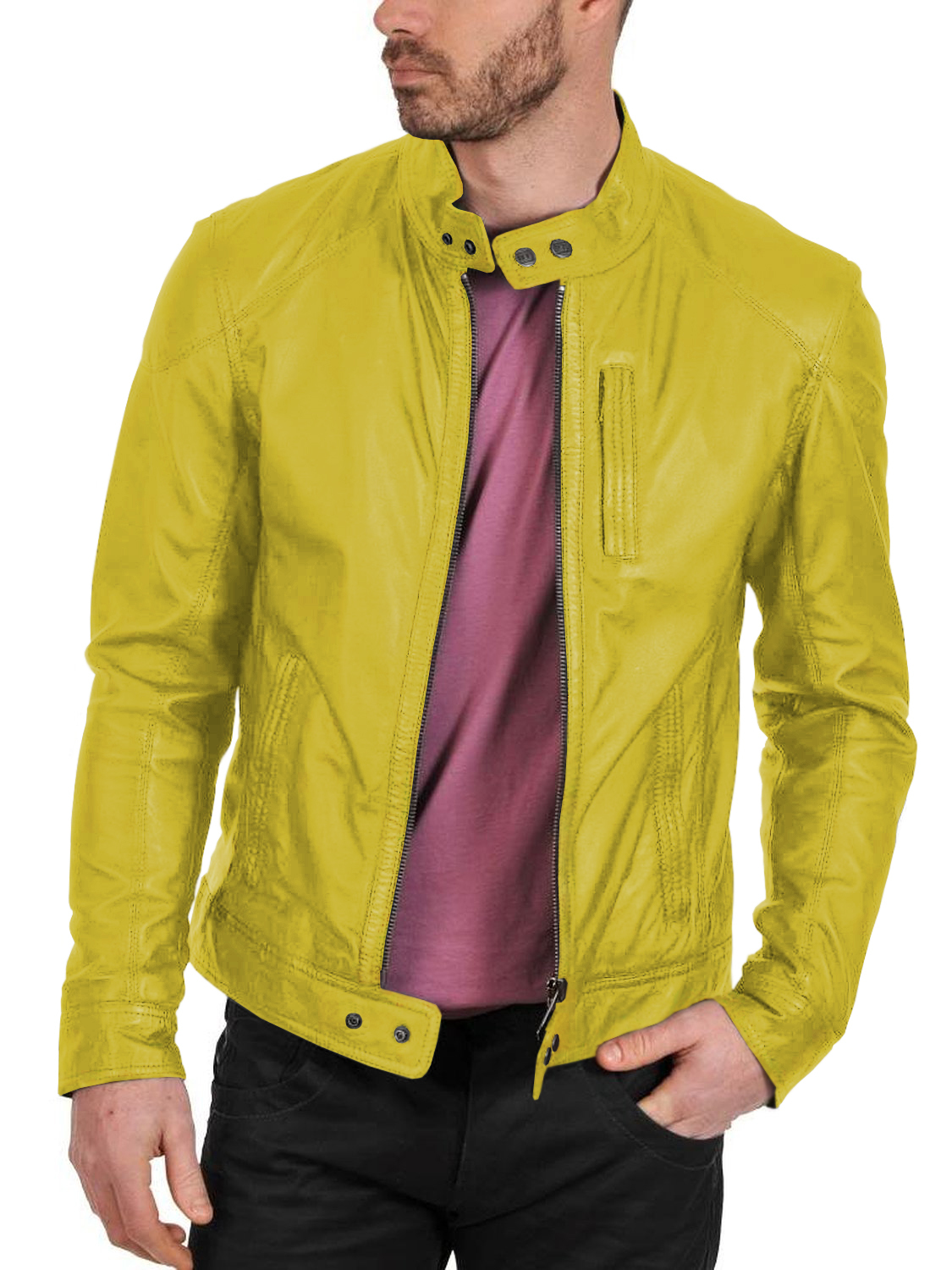 Mens Leather Jacket, Yellow Lambskin Leather, stand collar, classic style.