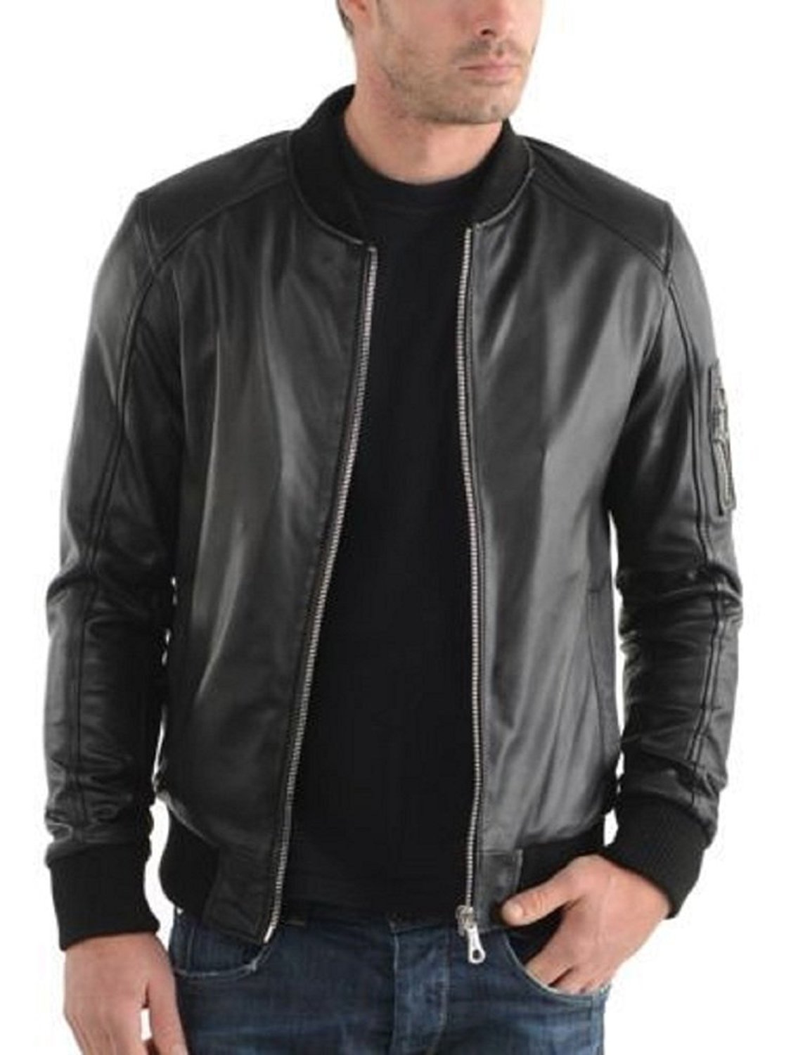 Mens Leather Jacket, Formal Bomber Style, Black Lambskin Leather, Shine style.