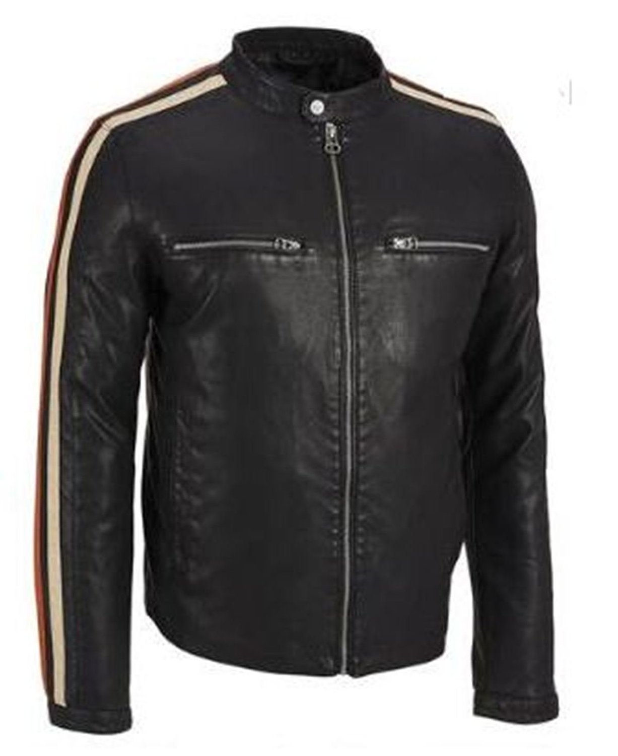 Mens Leather Jackey Black Biker White Strip Sleeves Zipper Leather Jacket