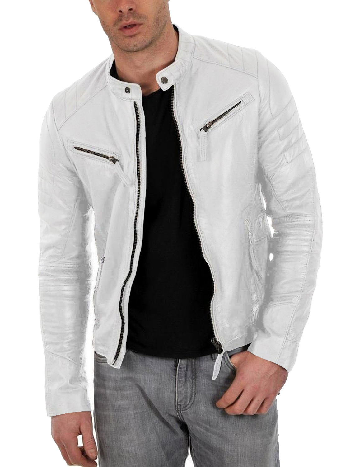 Mens Leather Jacket, White Motorcycle Lambskin shine Jacket, stand collar.