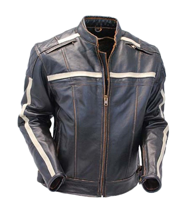 Mens Leather Jacket Black Quilted Stripped Lines Stylish Biker Jacket