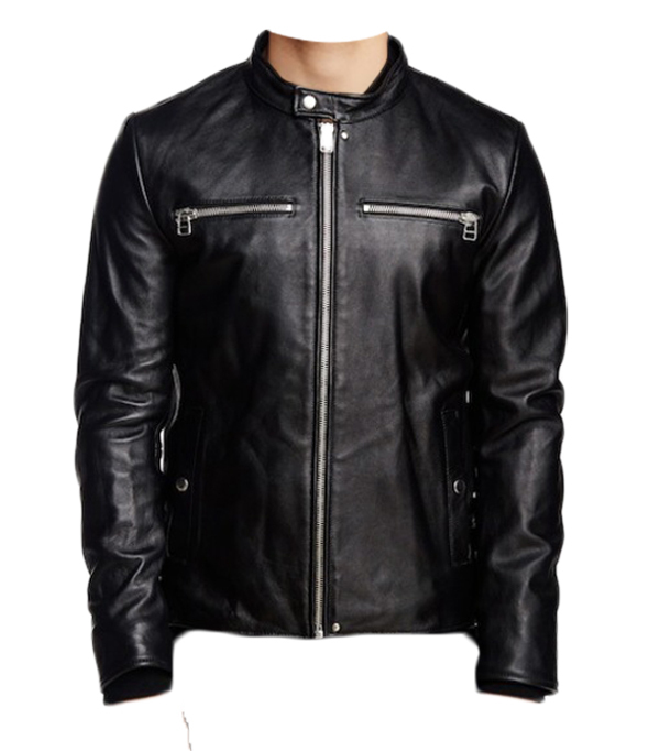 Mens Biker Leather Jacket Black Hood Buttoned Neck Double Zipper Jacket