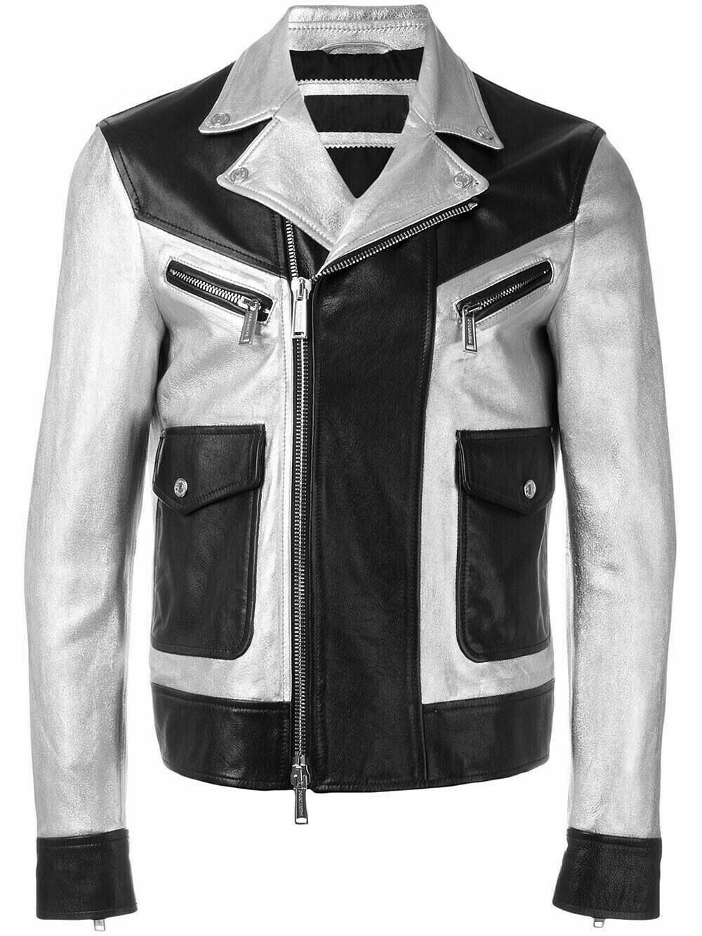 Men's Black Silver Metallic Genuine Motorcycle Leather Jacket