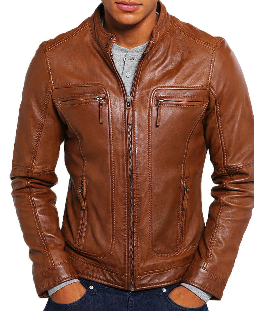 Men's Stylish Genuine Lambskin Motorcycle Bomber Biker Leather Jacket