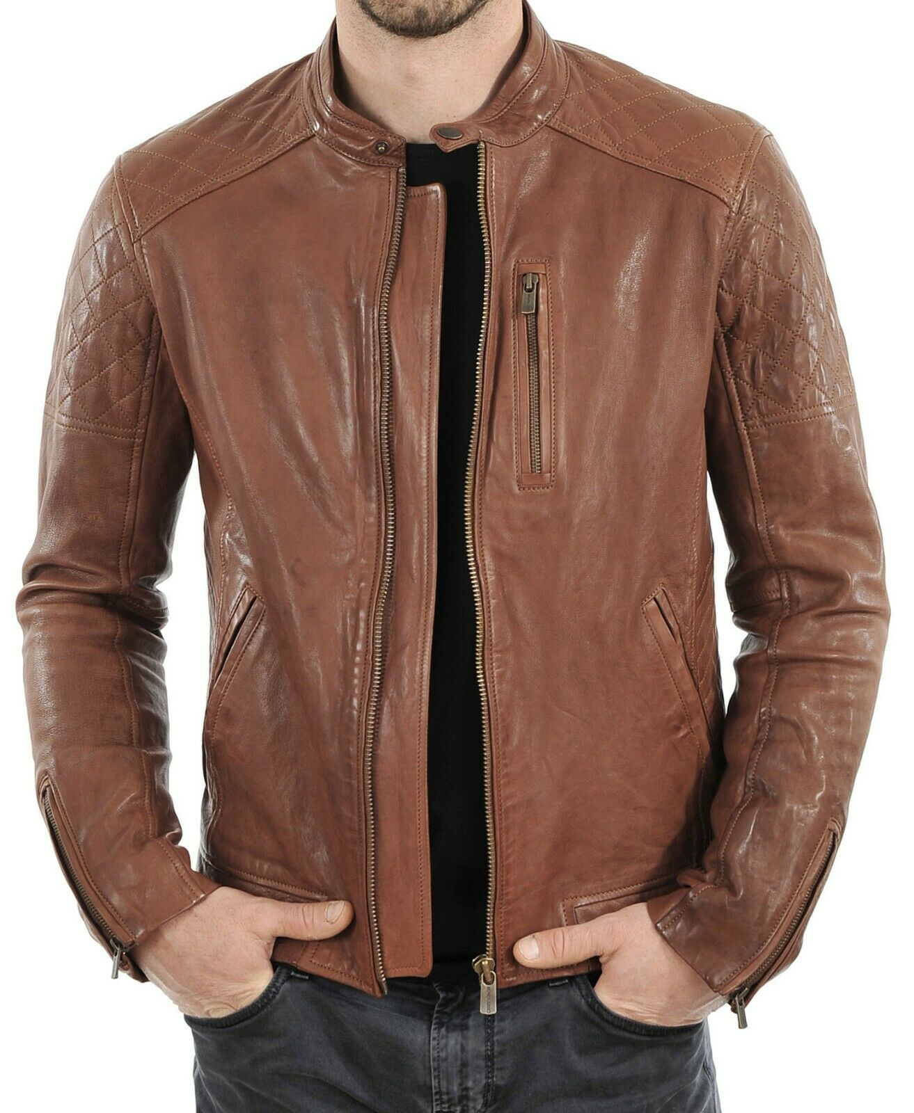 Men's Stylish Genuine Lambskin Motorcycle Bomber Biker Leather Jacket