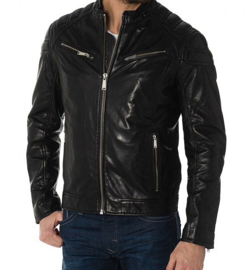 SkinOutfit Men's Stylish Genuine Lambskin Bomber Biker Moto Leather Jacket