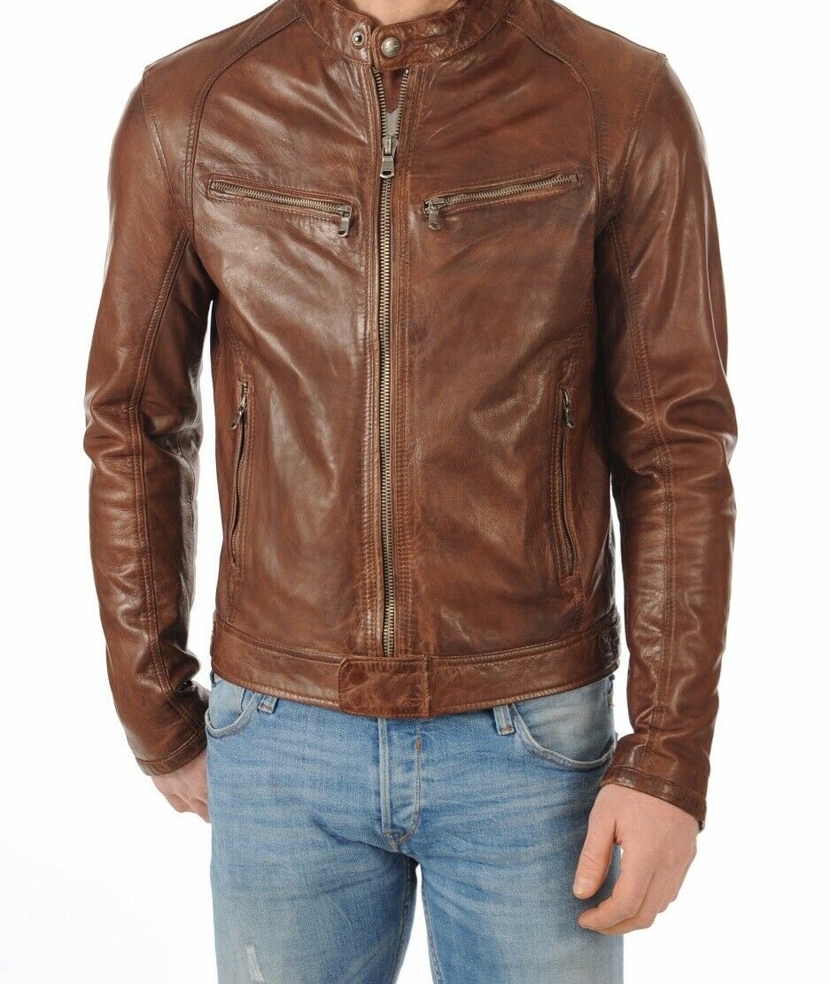 SkinOutfit Men's Stylish Genuine Lambskin Bomber Biker Moto Leather Jacket