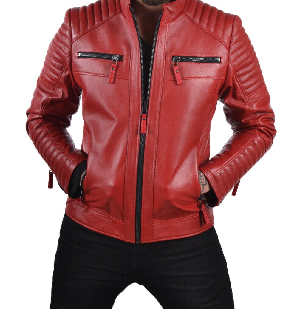 Men's Stylish Genuine Lambskin Bomber Biker Moto Leather Jacket Red
