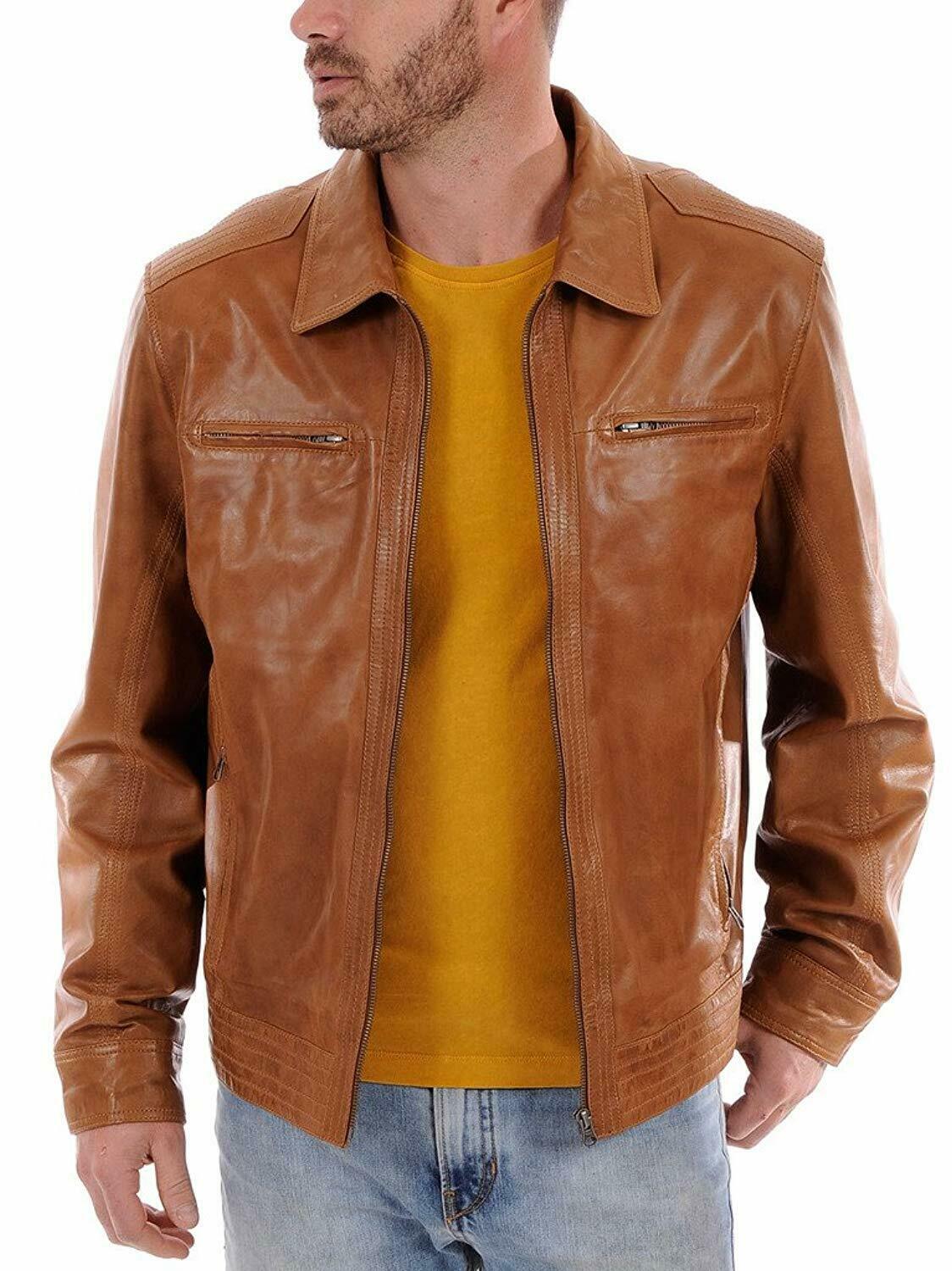 Men's Leather Jacket Motorcycle Brown Slim fit Biker Genuine lambskin jacket