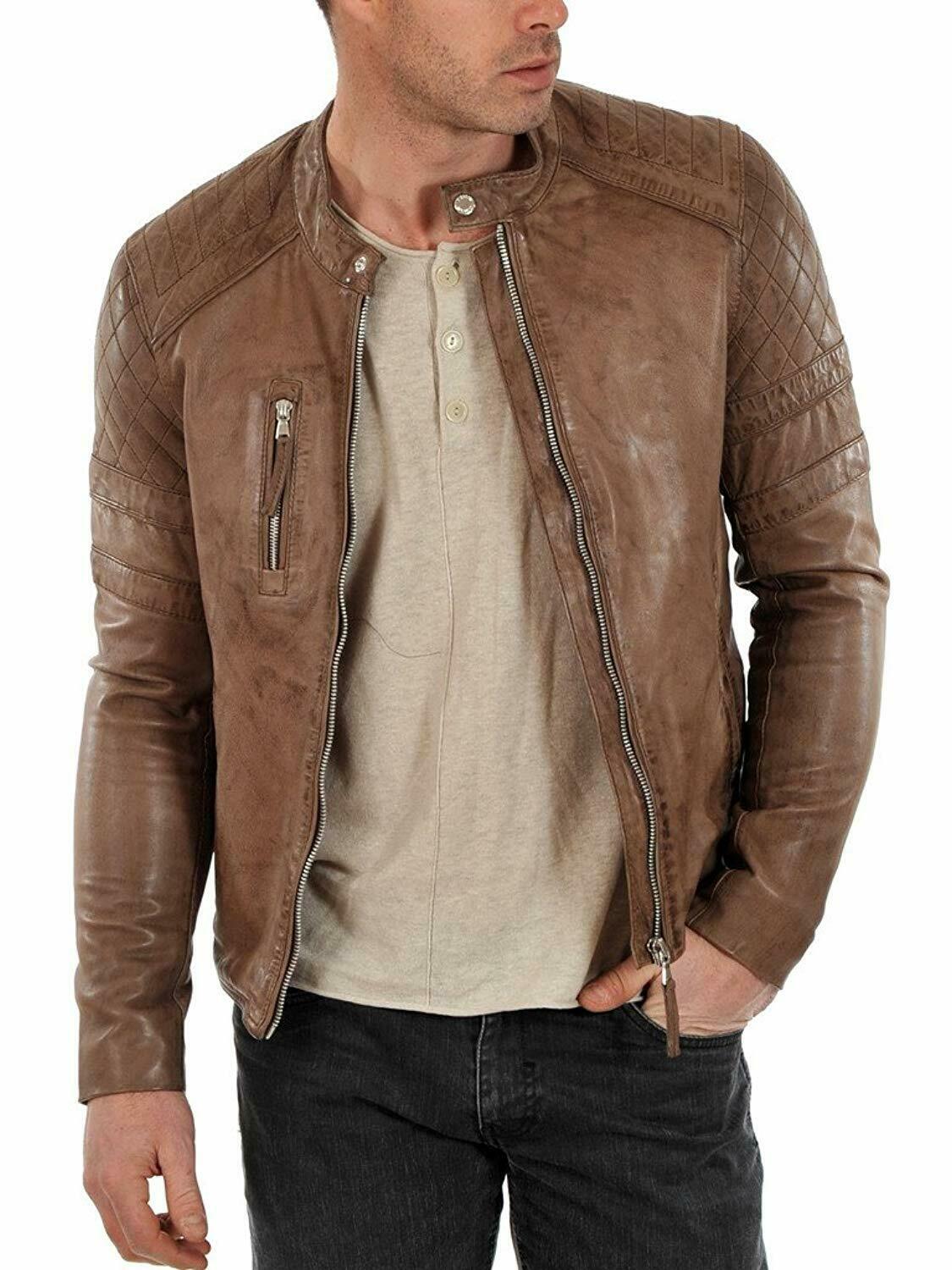 Men's Leather Jacket Motorcycle Brown Slim fit Biker Genuine lambskin jacket
