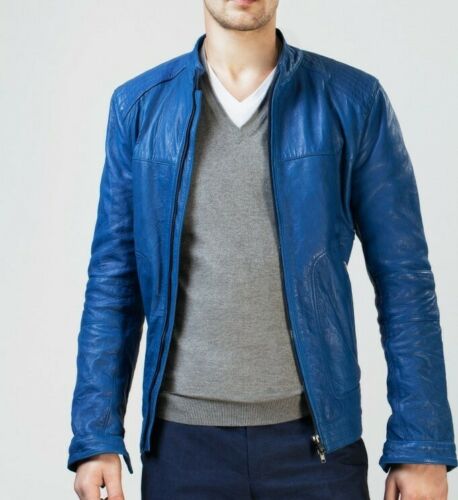 New Men Jacket 100% Genuine Blue Lambskin Leather Motorcycle Biker