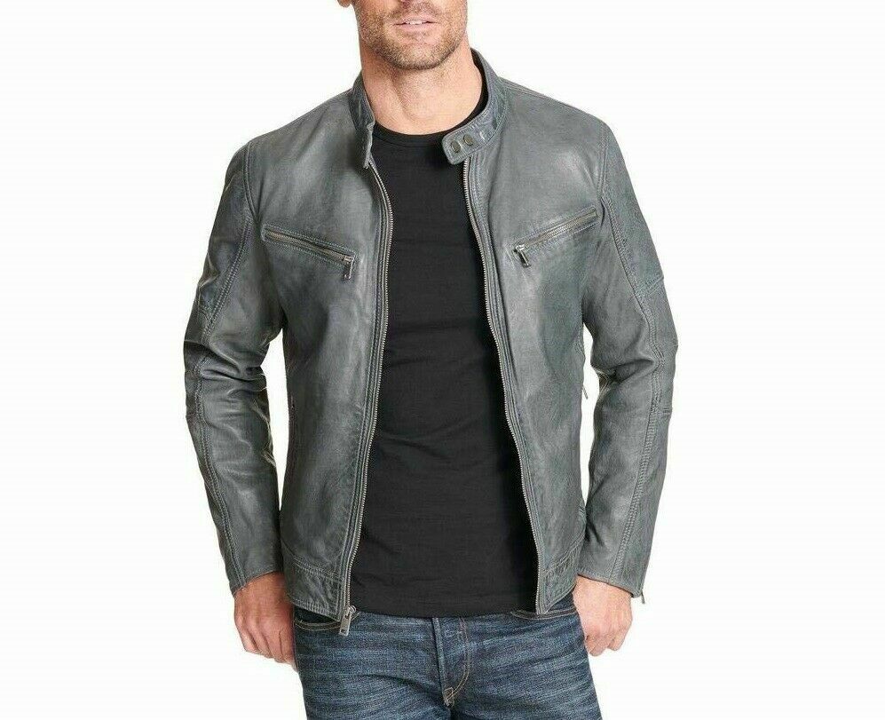 New Men Genuine Gray Lambskin Leather Jacket Biker Motorcycle Slim Fit Wear