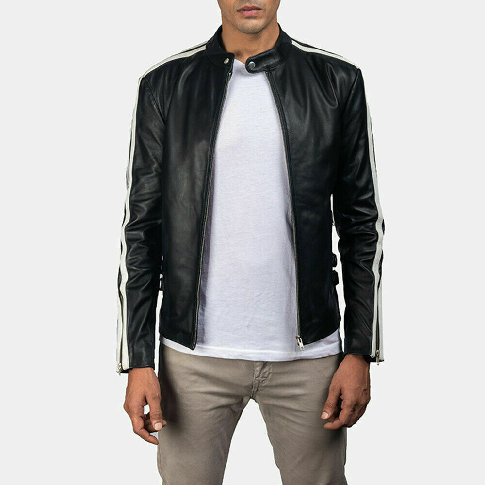 Men Black Jacket White Stripes Sleeves Lambskin Leather