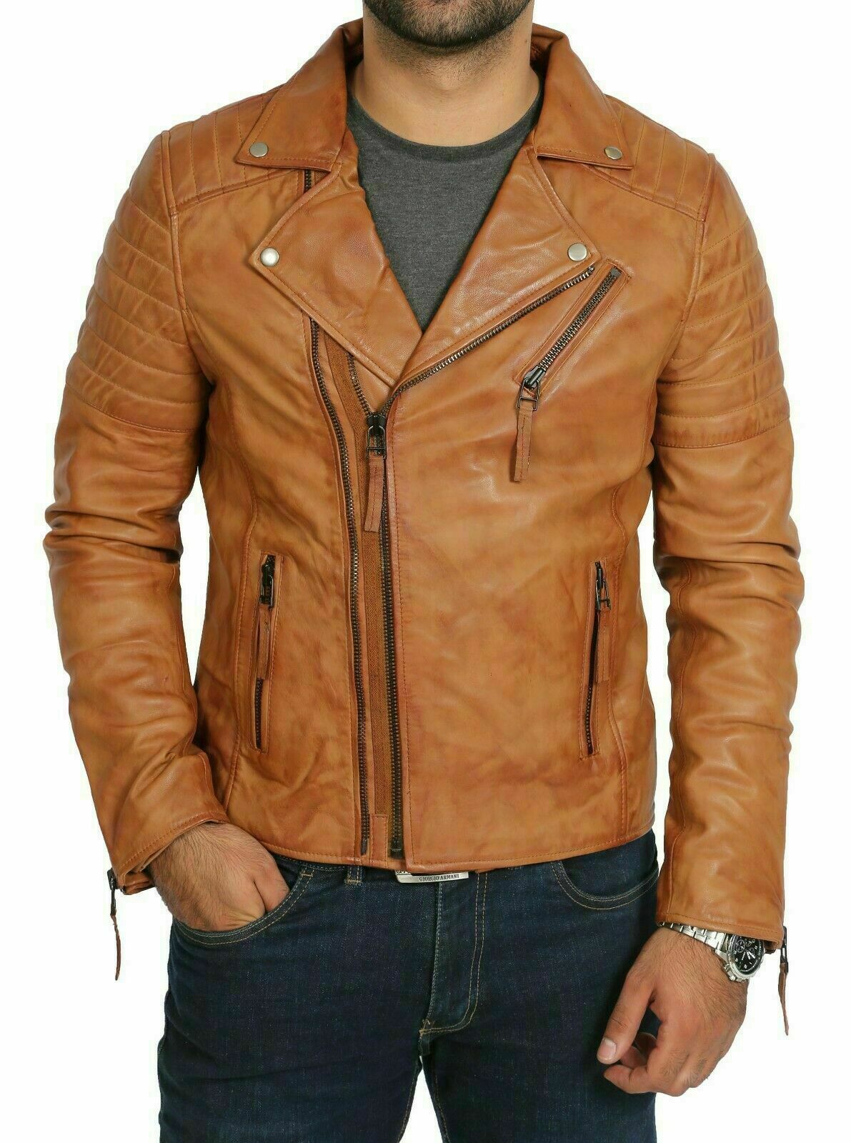 New Men's Sheepskin 100% Leather Jacket Biker Motorcycle Stylish Tan Coat