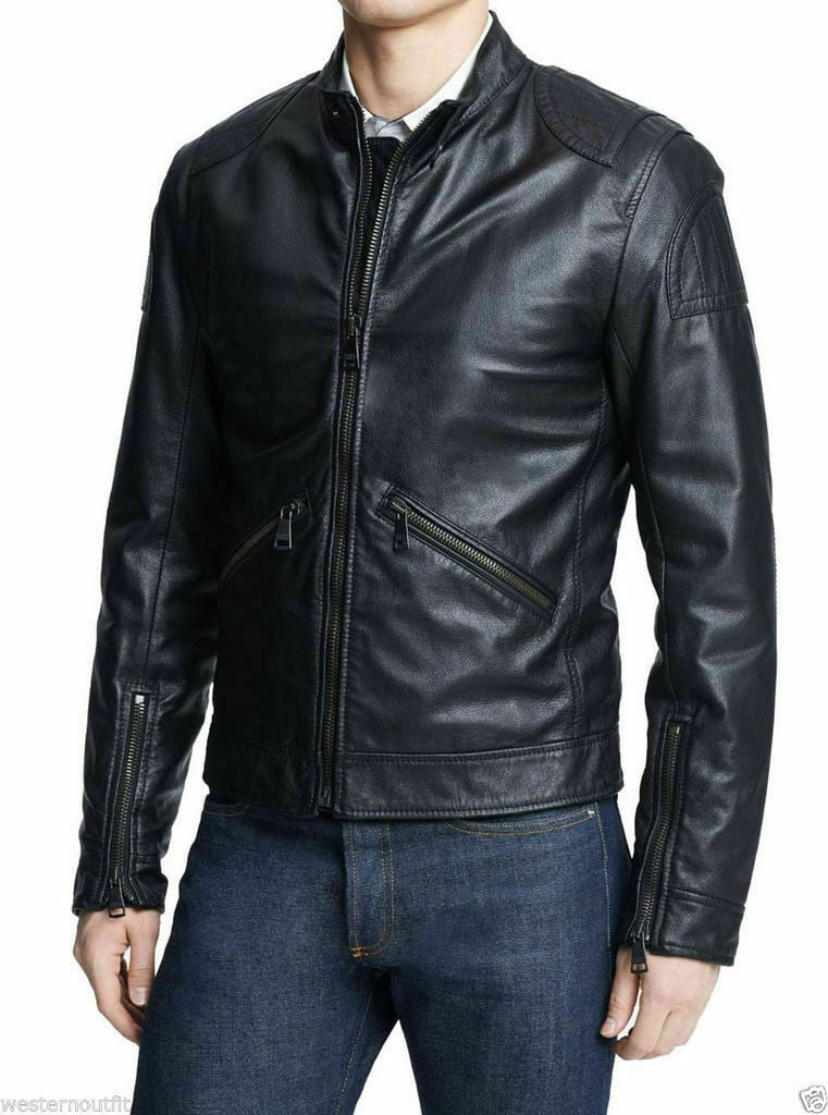 Men's real lambskin leather biker jacket motorcycle slim fit back zipper