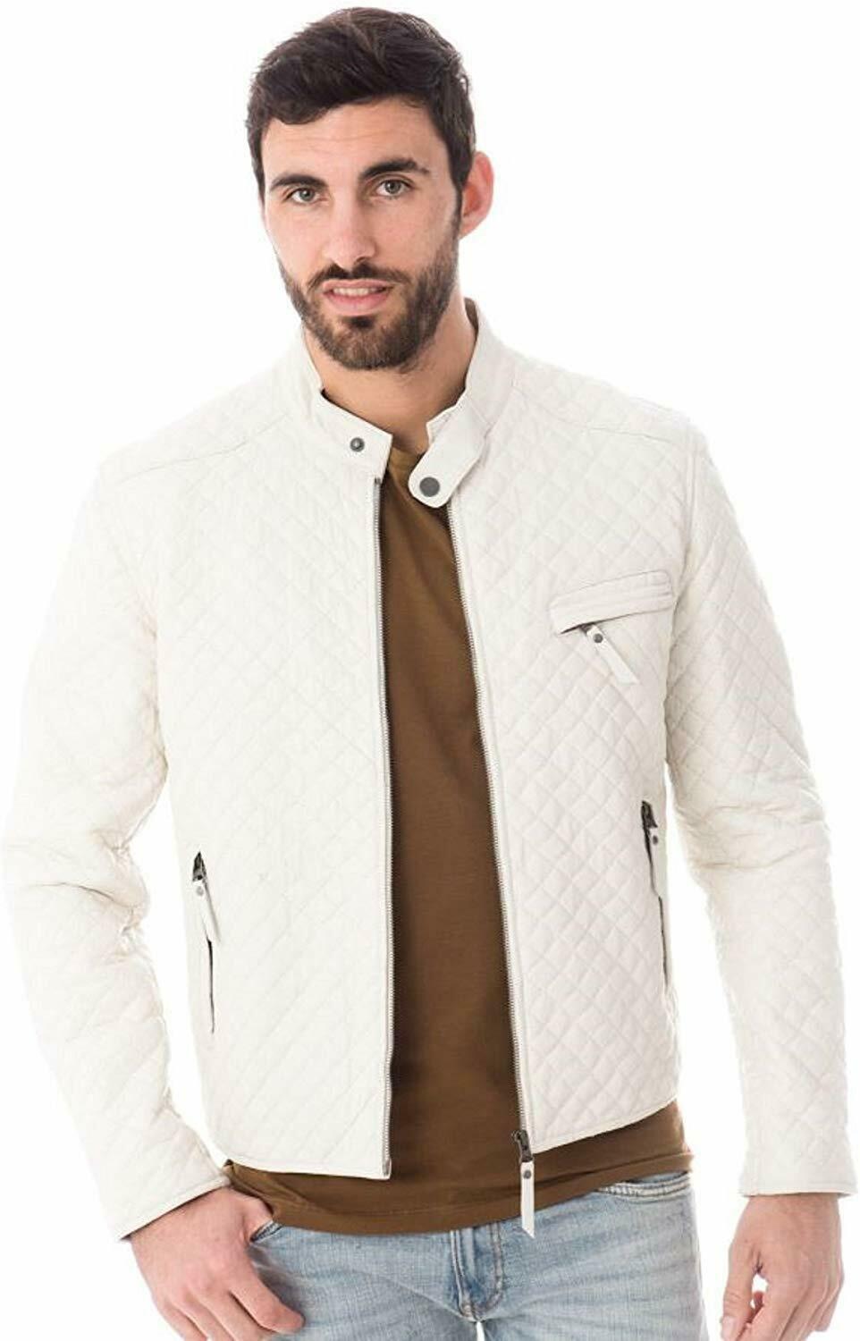 New men's lamb leather motorcycle biker jacket slim fit zipper beige jacket