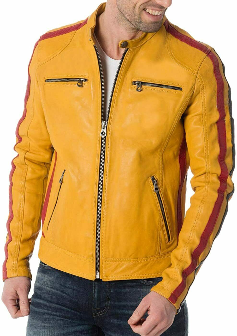 Men Lambskin Real Leather Jacket Biker Motorcycle Slim Fit Designer Yellow Coat
