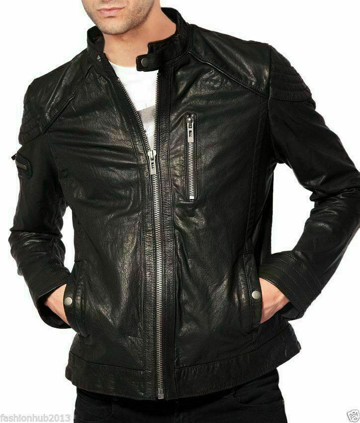New Men Genuine Lambskin Leather Motorcycle Biker Jacket Zipper Black Jacket