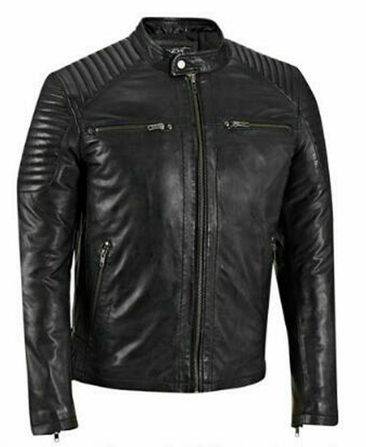 Men's lamb leather real leather biker jacket tight fit black motorcycle