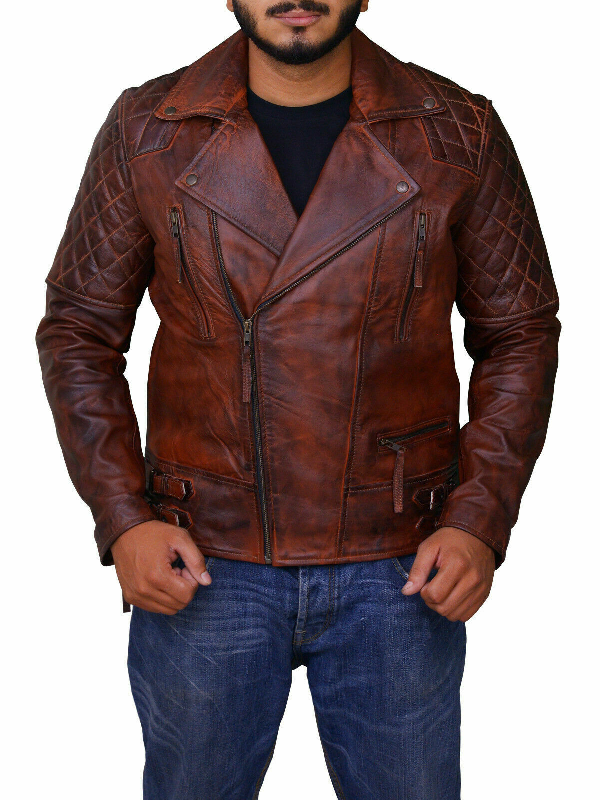 New men's real lamb leather motorcycle biker jacket zipper antique brown