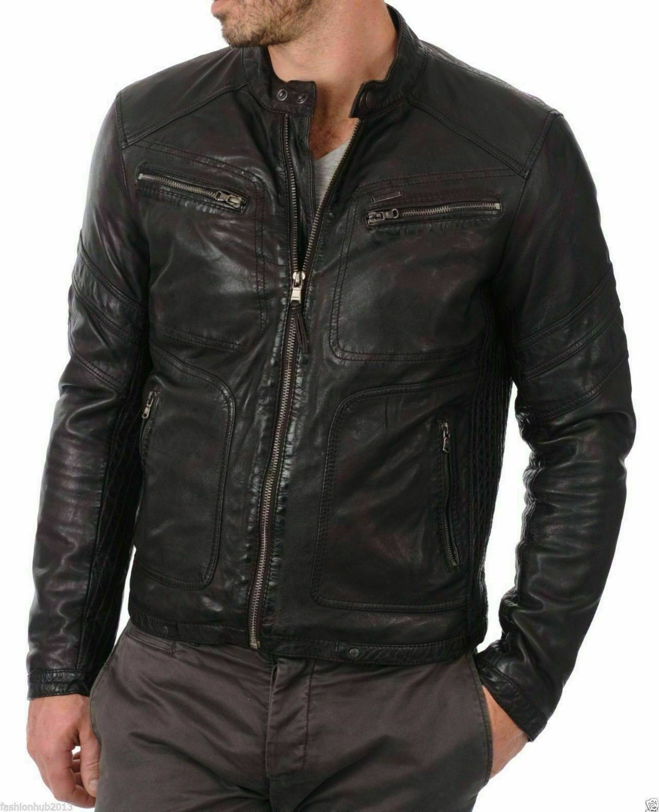 New Men's Genuine Lambskin Real Leather Biker Motorcycle Black Jacket Slim Fit