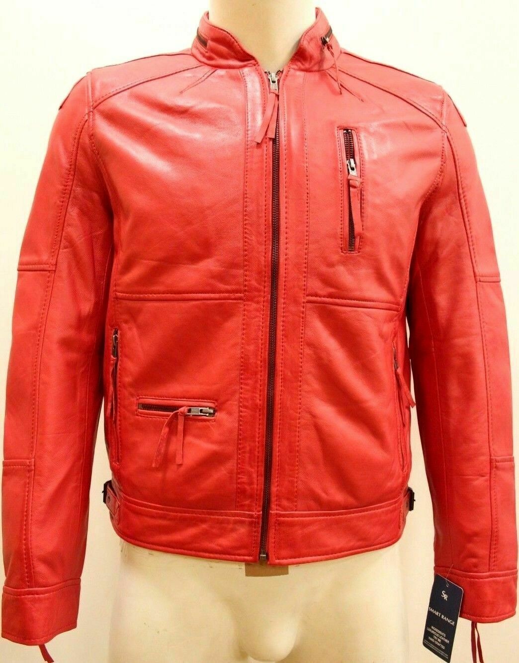 New Men Genuine Sheepskin 100% Red Biker Jacket Coat Zip