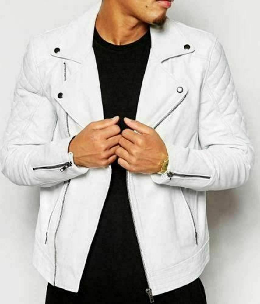 Men Genuine Lambskin Real Leather Biker Jacket Motorcycle Slim Fit White Stylish