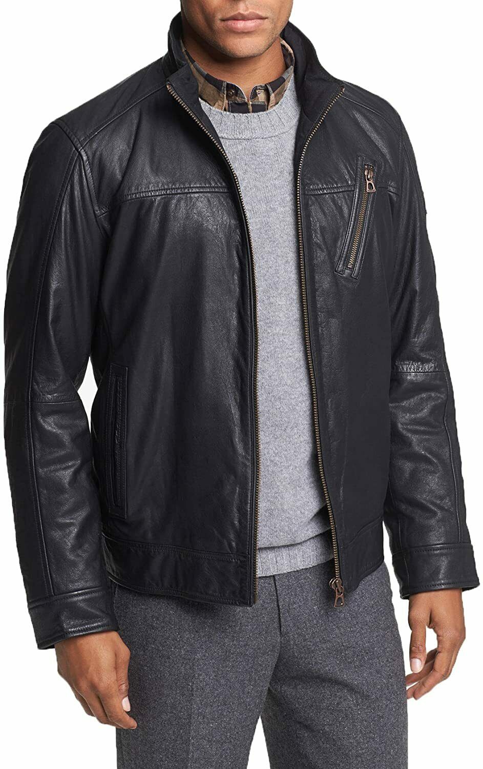 Men's Genuine Sheepskin Leather Jacket Motorcycle Biker Slim Fit Navy Blue Coat