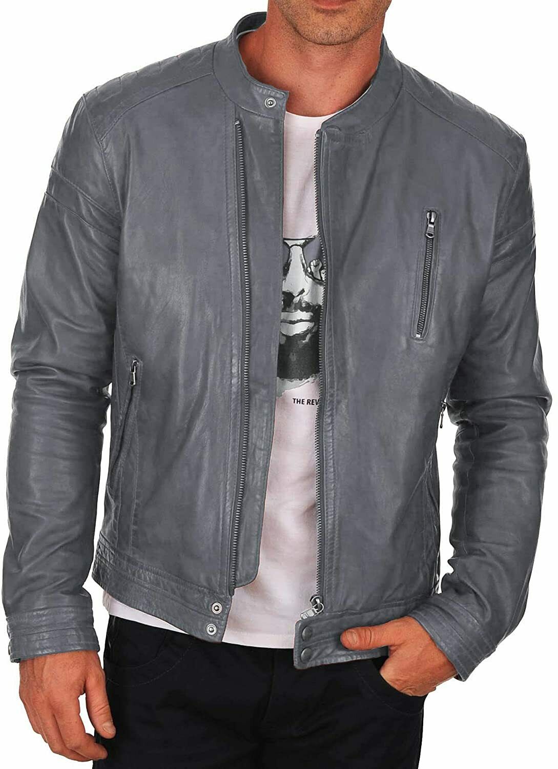 Men Lambskin Authentic Leather Jacket Motorcycle Biker Outwear Casual Grey Coat