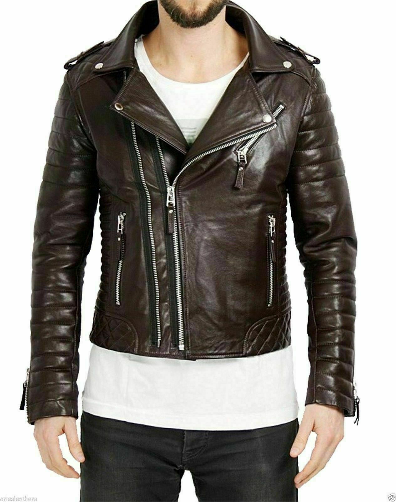 Men Genuine Lambskin Real Leather Biker Jacket Motorcycle Slim Fit Black Zipper