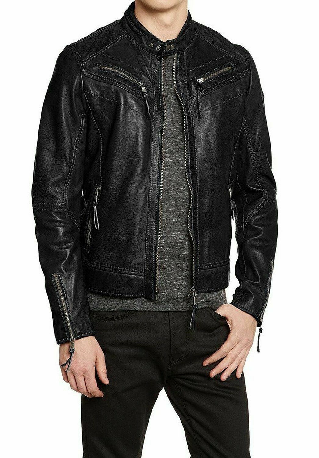 Men's Lambskin Leather Motorcycle Stylish Slim Fit Biker Zipper Black Jacket