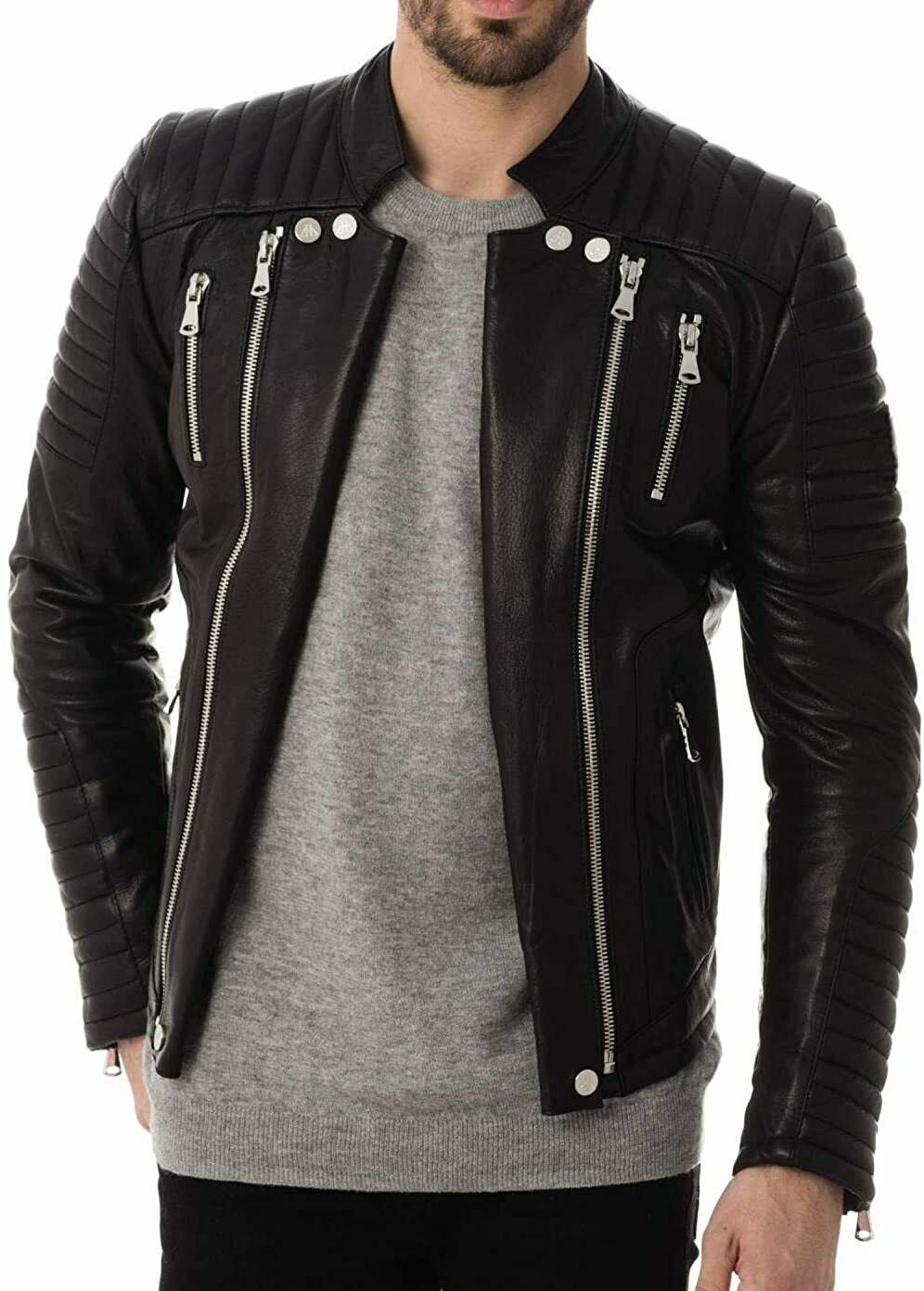 Classic Men's Authentic Lambskin Leather Jacket Biker Black Stylish Zipper Coat